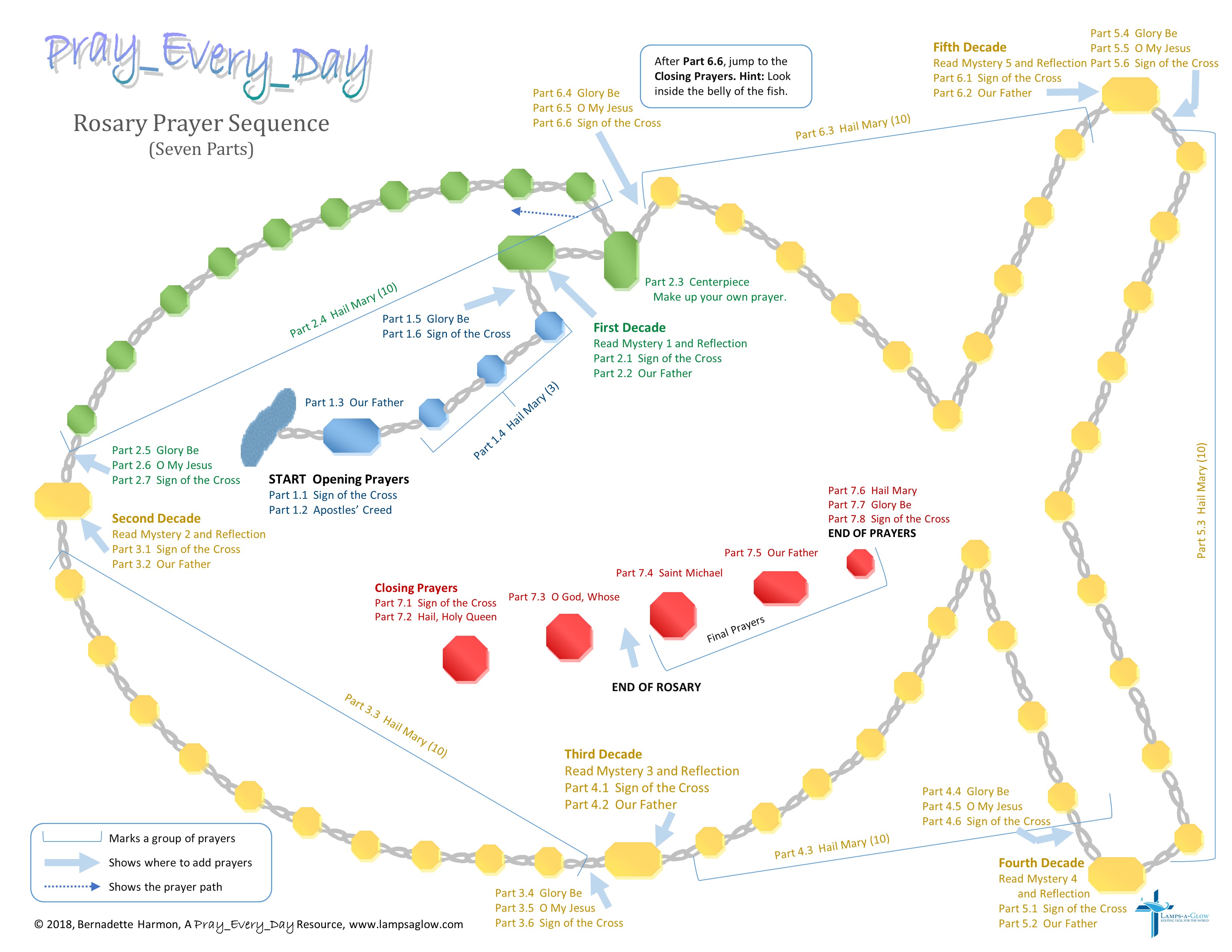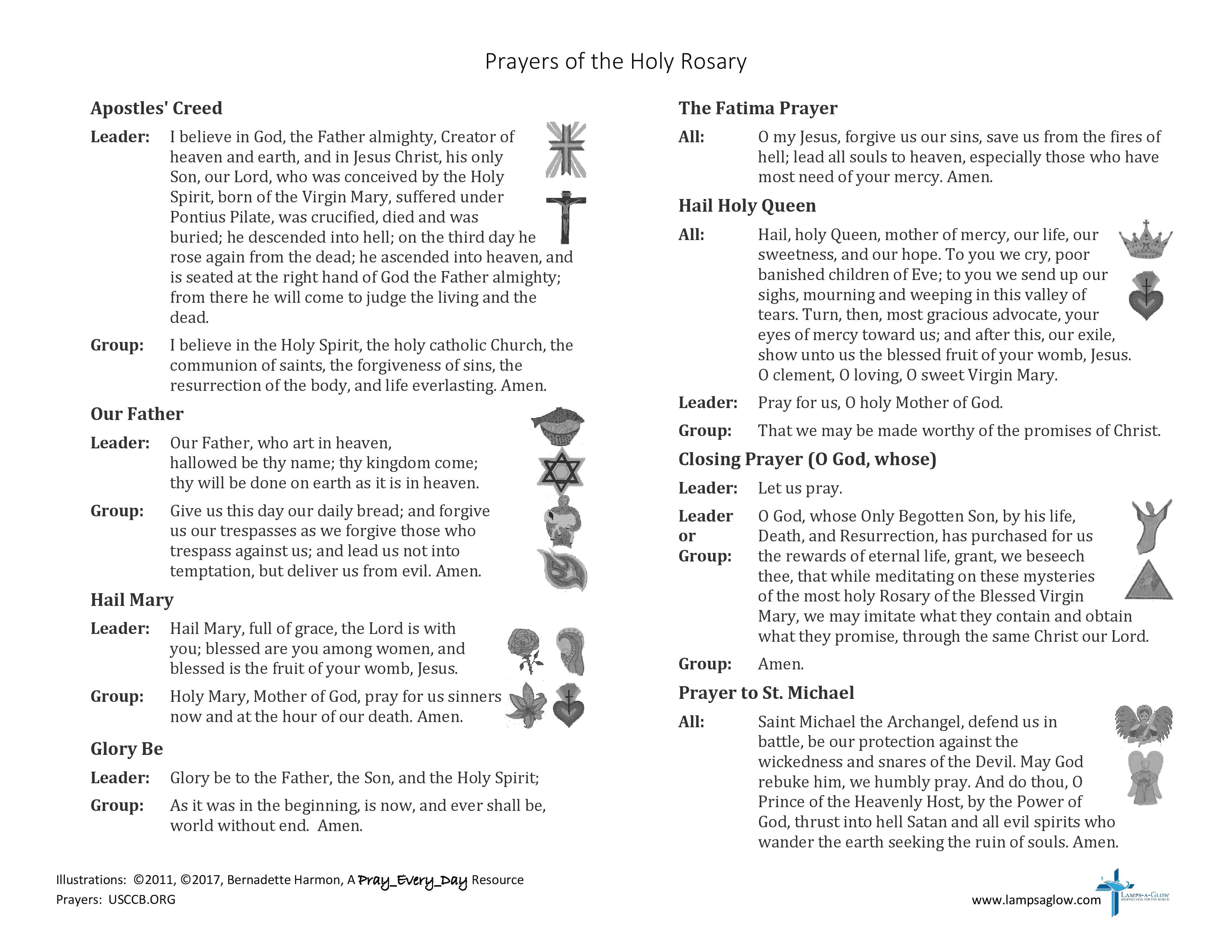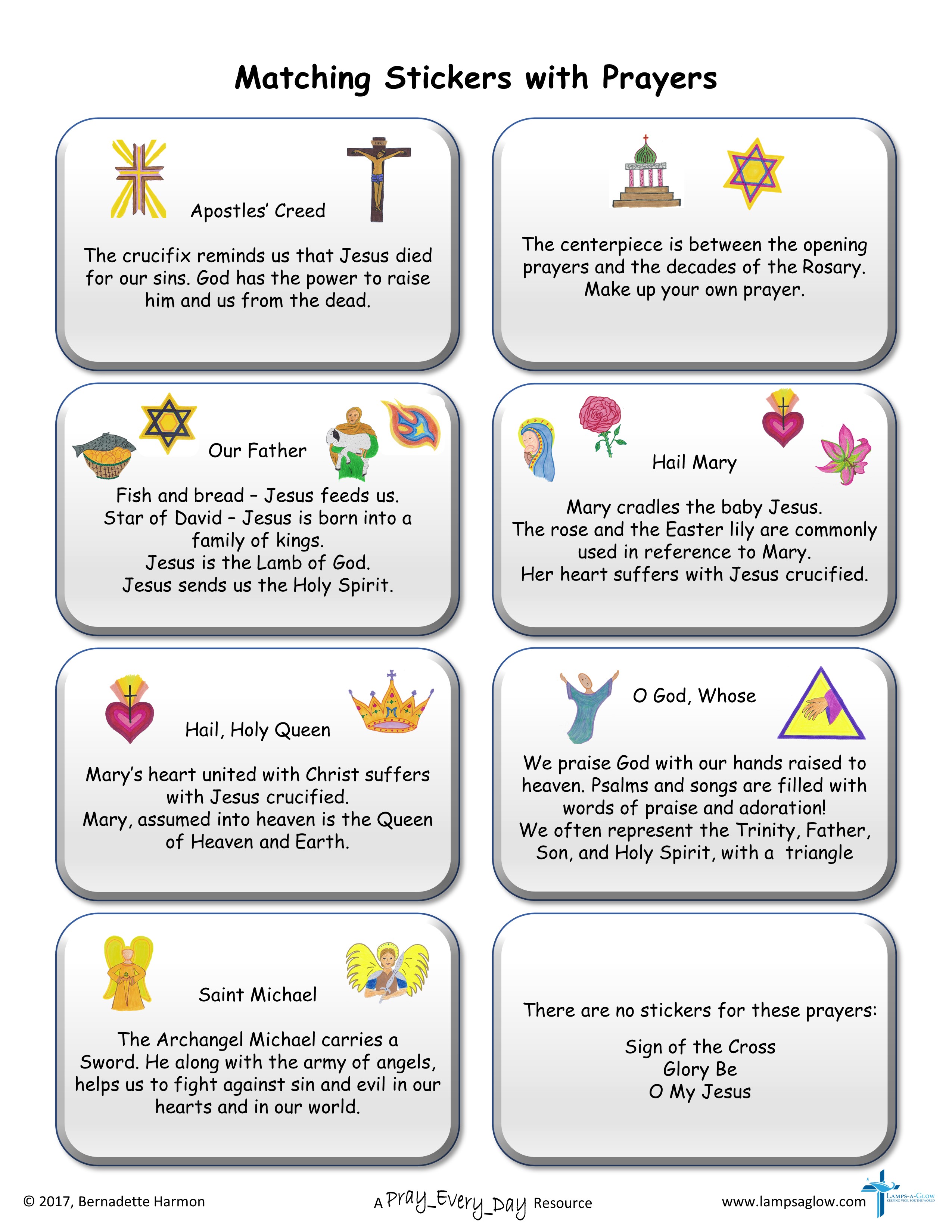 - includes all of the prayers of the rosary, prayer pages for each mystery of the Rosary, associates the prayers with the stickers, and steps you through the sequence of the rosary